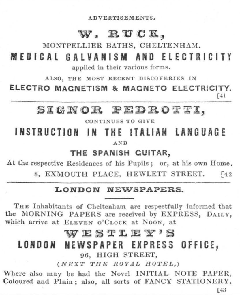 William Ruck was born in either 1812 or 1813 (depending on which census you believe) and was living in Sandford Street at the time of the 1841 census where he gave his occupation as a male servant. Five years later he appears in the 1846 Cheltenham Annuaire directory of advertisements as a medical galvanist at the Montpellier Baths, which means he must have been practising there from at least some point in 1845. The 1851 census shows him now living at the property with his wife, one son, and two servants; by 1861 he has three more sons and a daughter.