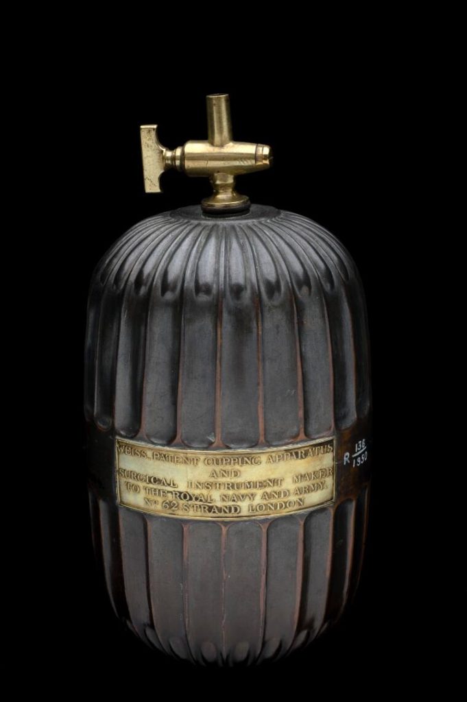 The cupping set seen here dates from the same period and the label reads ‘Weiss, Patent Cupping Apparatus And Surgical Instrument Maker To The Royal Navy And Army, No 62 Strand, London’.