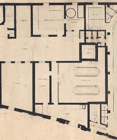 At the beginning of February 1862 the owners of the building, the Globe Insurance Company, agreed to lease it to the newly-established Montpellier Gardens Company and a floor plan was approved by the Globe on 22nd of that month. While it shows the layout at that time it’s impossible to know just how long it had looked like this as any plans made after 1814 – which must have existed – have not survived. Many of the elements from the 1856 auction listing can clearly be seen on this plan but not all of them. Had they been removed or are they down in the cellars with the boilers (note the stairs) where much of the production took place in previous years? The machine shop with mill for grinding salts would still be needed and ought to be positioned close to the crystallizing and bottling rooms – was it above them via the stairs in the latter?
