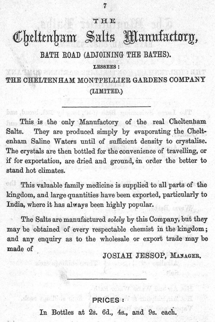 One of the shareholders, William Barron, was so concerned about the future of the salts he wrote independently to the Town Improvement Committee ahead of their meeting on 10 November 1897. Not only that, but he must have tipped off someone else about the matter for the minutes record that letters had been received from Barron and a Dr Ward-Humphreys, with both men suggesting that ‘the council should not allow the manufacture of Cheltenham Salts to fall into disuetude, which would be the case if they took no action’. The matter was adjourned until the December meeting at which point the Committee agreed to pay ‘a visit to the Montpellier Baths to inspect the apparatus there, formerly used for the evaporation of the water’ – the use of ‘formerly’ indicates that after the disastrous results at the annual general meeting the plug had been pulled on the salts.