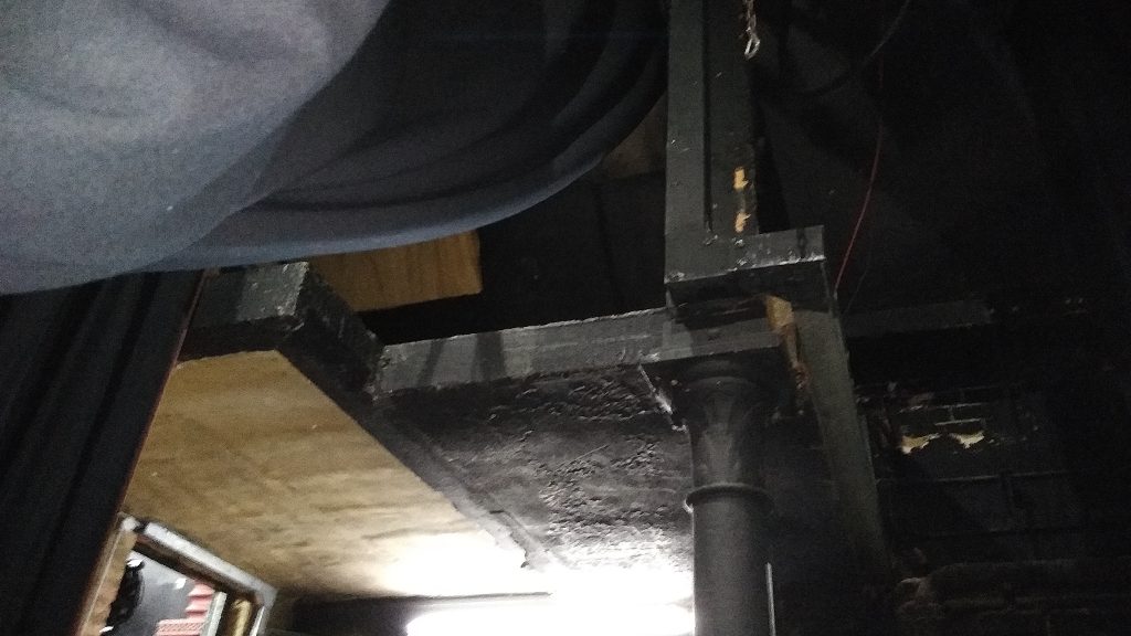 As the heat intensified the glass ceilings began to crack, allowing air to enter the building and help spread the fire along the balcony and towards the stage. The glass that fell onto the balcony floor then melted and you can still see this today, the balcony now being used for sound control and follow spot operating.