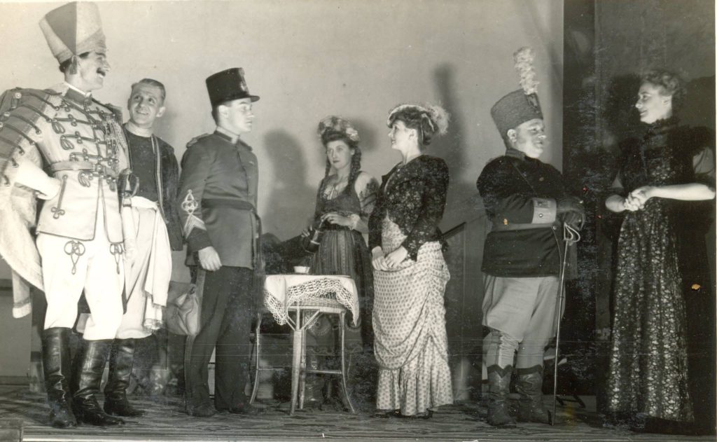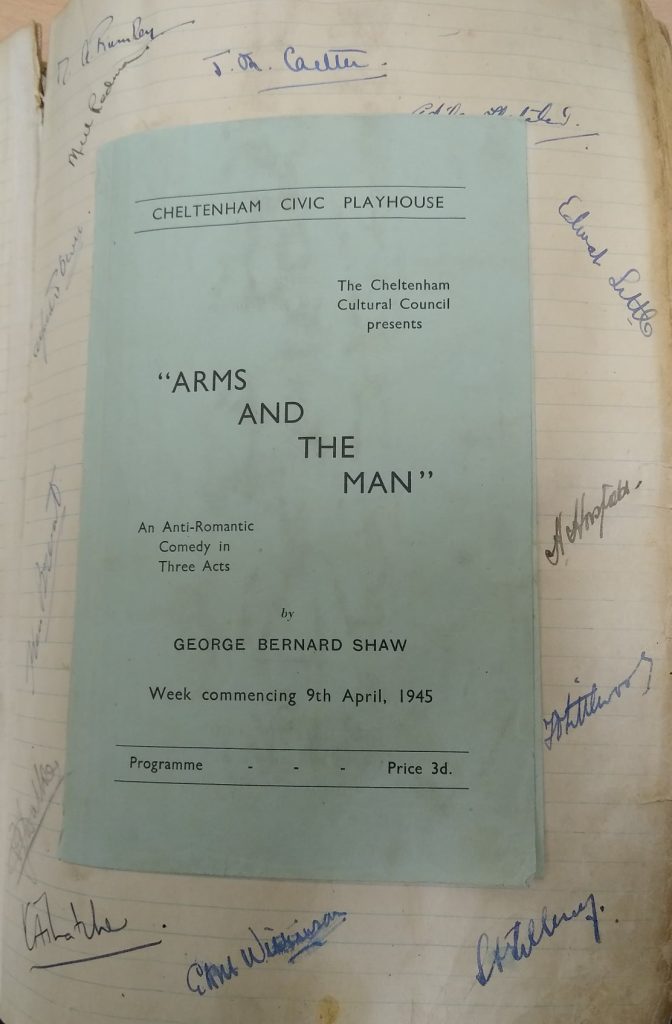 While several of the town’s existing amateur companies offered to present the first production at the new theatre it was agreed that such an occasion should be open to all. George Bernard Shaw‘s Arms & The Man was chosen and auditions were held resulting in a cast consisting of performers from the Dowty Players, the Rotol Players, and Cheltenham Little Theatre. The production had just four weeks to rehearse and was to be directed jointly by Kenneth Thatcher (of the Rotol) and, appropriately, Frank Littlewood.