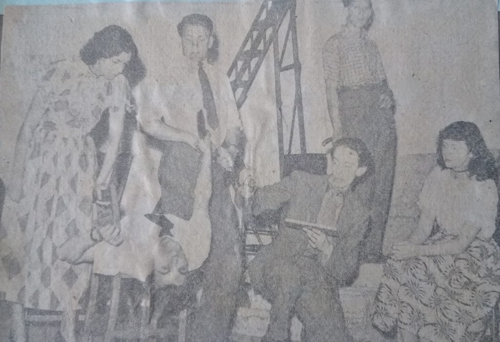‘Mr Tynan has seen fit to dress the play in Georgian costumes. Although it did not hamper the play, it is the worst costume for the amateur, for it demands such grace and deportment in the wearing, and much that was meant for grace on Saturday night only succeeded in being clumsy on the small stage. The mausoleum setting was very effective and well lit, and with adaptation would have served for the whole play. The Georgian drawing room was less regal than old-fashioned boarding house.